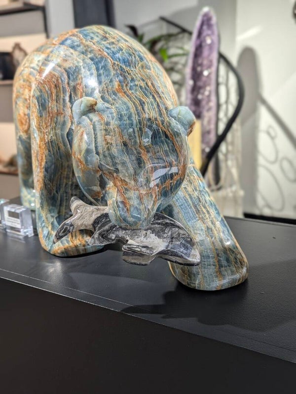 Ours en Onyx bleu d'argentine de grande taille, poids 75 Kg, façonnée et scultpé à la main.