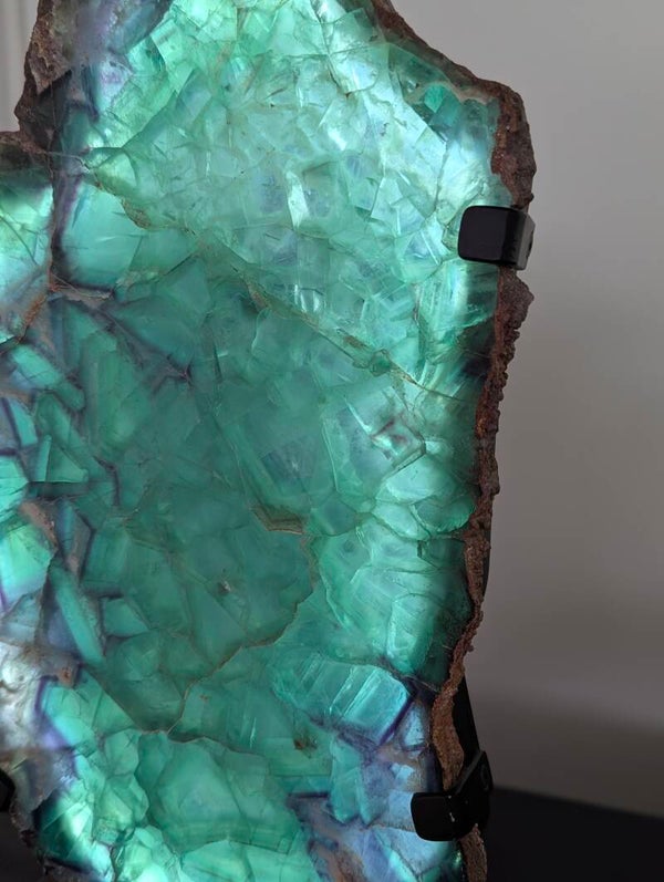 Cette tranche de Fluorite apportera une ambiance chaleureuse dans votre chambre ou à côté de votre canapé.